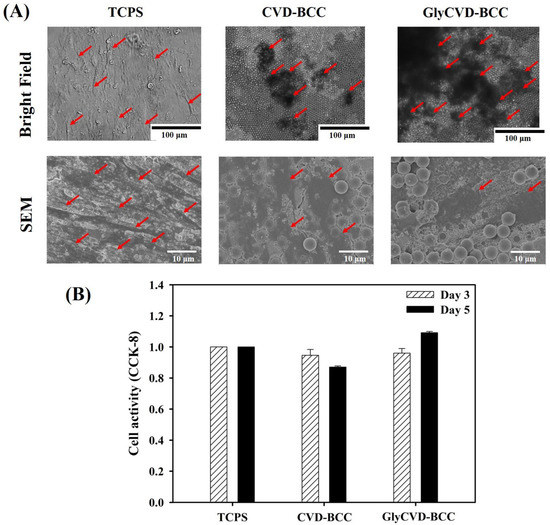(A) Cell morphology of the hBMSCs cultured on TCPS, CVD-BCC, and GlyCVD-BCC at day 5. It should be noted that cells formed aggregates and detached after multiple rinses during the fixing process. Arrows indicate the cells. (B) Cell activity using CCK-8 analysis at day 3 and day 5. Cell activity on the hybrid surfaces was normalized to the TCPS control (n = 6).
