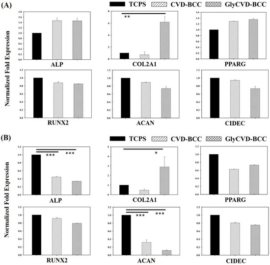 Gene expression of osteocyte genes (ALP and RUNX2), chondrocyte genes (COL2A and ACAN), and adipocyte genes (PPARG and CIDEC) of hBMSCs cultured on TCPS, CVD-BCC, and GlyCVD-BCC surfaces after (A) 3 days and (B) 14 days of culture. Asterisks denote significant differences between samples (n = 3). * p < 0.05, ** p < 0.01, and *** p < 0.001.