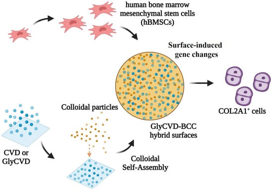 Scheme of this study. Hybrid structures are, for the first time, fabricated using two technologies, CVD and cSAPs. The surface structure can be tuned by the fabrication process. Unique hierarchical structures are able to be produced. Hybrid surface, especially GlyCVD-BCC, alters cell morphology, growth, and gene expression of human bone marrow stem cells (hBMSCs). Cell morphology is aggregated and the gene expression of COL2A1 is upregulated on the GlyCVD-BCC surface. The study demonstrates the potentiall of combining two coating technologies for the generation of hybrid structures that can stimulate gene expression of hMSCs without chemical induction.