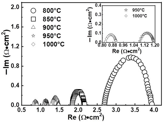 The polarization resistance properties of the cathode were tested using the AC impedance method. Figure 7 shows the Nyquist diagrams of the YSZ/LSM cathode after annealing at 1050 °C for 2 h, which were tested at 800–1000 °C. Each curve intercepted the real axis at a low and a high frequency, respectively. The high frequency intercept R0 is the overall ohmic resistances, including the YSZ ionic resistance, LSM electronic resistance, contact resistance between the electrode and Pt mesh, and external cell connection resistance. The intercept difference between the low and high frequency of the semicircle represents the cathode polarization Rp, as shown in Figure 7. The polarization resistance decreases between the electrolyte and electrode as the temperature increases.
