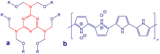 The molecular structure of (a) melamine/formaldehyde constituting the sponge, and (b) polypyrrole salt (hydrochloride). The melamine moiety is depicted in red; R = H or a linkage to another melamine unit.