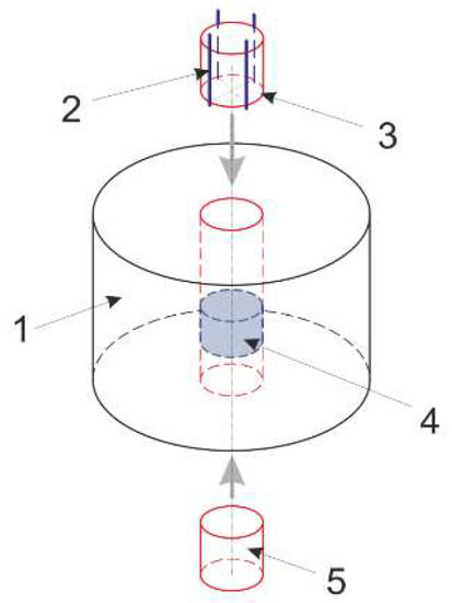 Four-point method of conductivity determination: 1—glass cylinder, 2—platinum/rhodium contact wires, 3—glass piston with incorporated platinum electrodes, 4—sponge, 5—glass support.