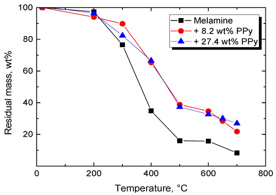 The residual mass of melamine sponge (black squares) and polypyrrole-coated melamine sponges after exposure to elevated temperature.