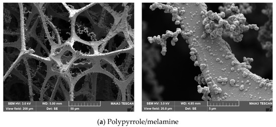 The threads in the melamine sponge became coated with a compact polypyrrole film with some adhering polypyrrole globules and their clusters (Figure 4a). Based on previous studies comparing the uncoated and polypyrrole-coated sponges, the polypyrrole shell was estimated be of submicrometre thickness [30]. It had already been established that the morphology did not change after carbonization (Figure 4b) [13], except for a minute shrinkage observable only on macroscopic samples.