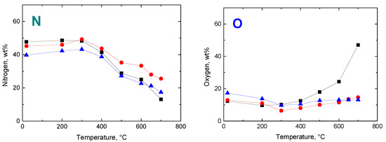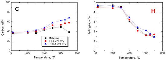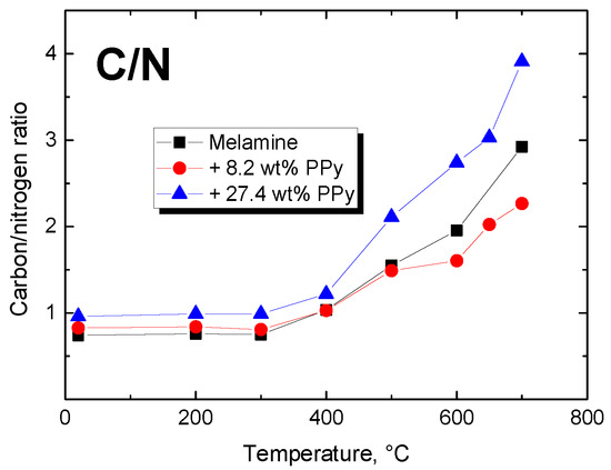 The term carbonization implies that the carbon content should increase during this process, which was indeed the case for both polypyrrole-coated sponges (Figure 5). Yet, the samples contained a significant fraction of nitrogen, which was gradually reduced in the course of carbonization. The presence of lone electron pairs on nitrogen atoms is beneficial in applications involving adsorption phenomena, such as in electrodes in supercapacitors, or dye removal in water-pollution treatment, and also in heterogeneous catalysis. The atomic C/N ratio thus grew as the carbonization temperature increased (Figure 6). The hydrogen content was reduced, and most likely released, along with some oxygen, as water. The presence of oxygen in the samples derives mainly from formaldehyde links in melamine (Figure 1a), but it is known also to be present in polypyrrole [13,14]. The marked increase in oxygen content above 400 °C was observed only for neat melamine sponge (Figure 5, black squares) but not for the carbonized composites with polypyrrole, which can still be considered as nitrogen-containing carbons. The trends in the evolution of elemental composition were in accordance with an earlier study on neat polypyrrole powders [14]. It should be noted that the original composites also contained chlorine counter-ions in polypyrrole (Figure 1b), which were released as hydrochloric acid in the early stages of carbonization.