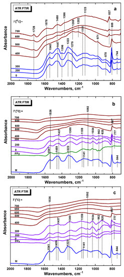 The evolution of the ATR FTIR spectra of (a) the melamine sponge (M), (b) the melamine sponge containing 8.2 wt%, and (c) 27.4 wt% polypyrrole, after exposure to various temperatures in inert atmosphere. Polypyrrole (PPy) spectrum is included for comparison. The groups of similar spectra are distinguished by colors.