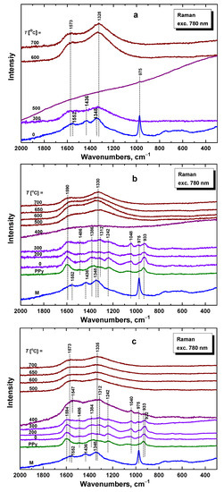 Raman spectra supported the results obtained by infrared spectroscopy. The spectrum of neat melamine sponge (M) recorded with a 780 nm laser excitation at the ambient temperature showed bands with maxima at 1552, 1436, and 1348 cm−1, and a sharp peak at 975 cm−1 (Figure 8a). They were transformed into two broad bands with maxima at 1573 and 1328 cm−1 at a temperature of 300 °C, and later at 600 and 700 °C. It was found that melamine was thermally stable and the first decomposition changes occurred only at 400 °C (Figure 3).