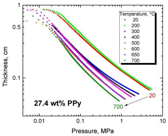 Dependence of the sample thickness on the applied pressure for polypyrrole-coated sponges after exposure to elevated temperatures.