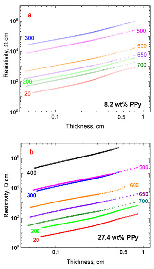 The resistivity was determined by the four-point van der Pauw method (cf. Experimental Methods) during compression from pressure of approximately 0.01 up to 1 MPa. As the pressure increased, the thickness of the sample decreased. In the double-logarithmic presentation, when resistivity is plotted against sample thickness, the curves are close to straight lines with approximately the same slope, regardless of the carbonization temperature, and even of polypyrrole content (Figure 11a,b). The dependence for the sample treated at 400 °C is missing in Figure 11a because the resistivity was too high to be determined using the present experimental setup.