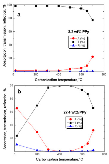 The effect of higher conductivity manifested itself in reasonable absorption by the original sponges with a higher polypyrrole content, 27.4 wt% (Figure 14b). It decreased to zero as the carbonization temperature reached 400–500 °C and the conductivity dropped (Figure 11). The absorption of radiation recovered at still higher carbonization temperatures in accordance with the increase in conductivity. The radiation reflection followed the same pattern, but its contribution was significantly lower than that of the absorption.