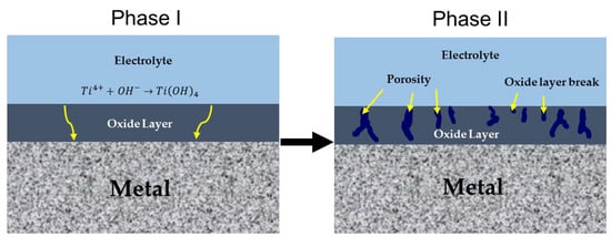The passive layer mechanism relates to the ions’ diffusion on the surface, in titanium and hydroxyl ions’ transfer. When the layer of TiO2 is generated, the interface metal–layer–electrolyte will be thermodynamically stable. These conditions increase with oxygen content, and an aqueous media environment facilitates dissociation. Moreover, temperature and pH play an essential role, and if all these factors are correctly combined, a stable oxide layer will be generated [,,,,,].