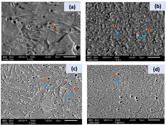 Figure 2a shows an SEM surface micrograph using a backscattered electron (BSE) detector for Ti CP2, where an α-phase microstructure matrix with large grain size is observed. Figure 2b shows the Ti-6Al-4V microstructure is fine and equiaxed because the cooling was slow in the recrystallization alloy. The α and β phases are marked with blue arrows. This phase has spherical shapes and α phases. The β phase increases in Ti-6Al-4V due to elements such as vanadium retained in β, so if vanadium or molybdenum increases its concentration in Ti alloys, the β phase will increase. Figure 2c shows the surface microstructure of Ti-6Al-2Sn-4Zr-2Mo; the alloy has grains of α phase, with an appreciable deformation and angular shapes located at triple points and corresponding to the β phase. Figure 2d shows a β-phase microstructure matrix for the Ti Beta-C alloy. For Ti CP2, Ti-6Al-2Sn-4Zr-2Mo, and Ti-6Al-4V alloys, porosity from the manufacturing process (about 1 to 2 µm in diameter) was observed.