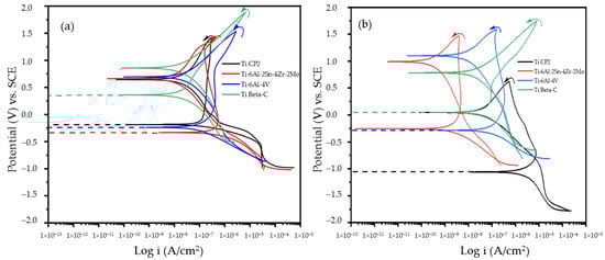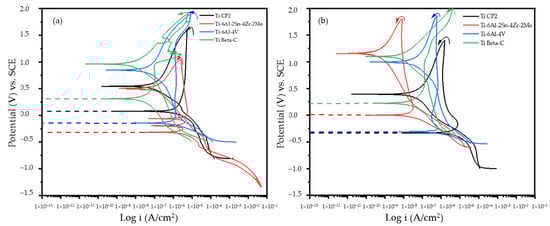 Further, icorr values of all samples are related to Ecorr, with Ti Beta-C presenting the lowest icorr (9.12 × 10−9 A/cm2), which is associated with lower corrosion kinetics. However, the anodized Ti Beta-C was the only one that did not present a passive behavior; this could be attributed to the dissolution of the anodized solution in this media. Moreover, titanium with alloying elements presented passive layer breakdown. Figure 5b presents a similar behavior for Ti Beta-C; however, in the media presented, a passivation range can be noted, where the passive layer prevents the material dissolution. Ti CP2 and Ti-6Al-4V showed a decrease in current demand in the passive zone, and this is related to the addition of ions to the surface, decreasing the electrons’ transfer.