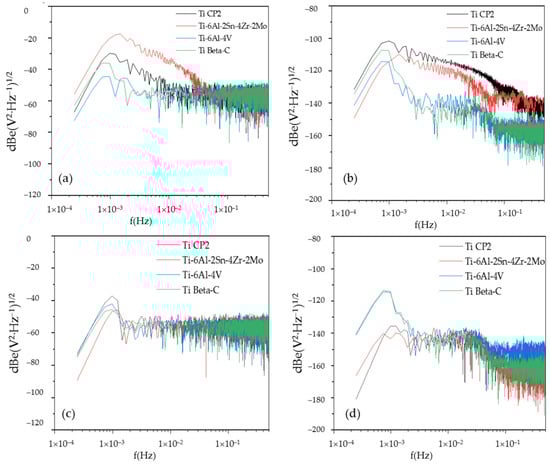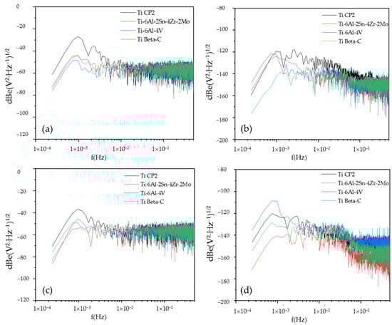 Power spectral density (PSD) in voltage for anodized titanium and alloy samples in (a) H2SO4 and (c) H3PO4. In current for (b) H2SO4 and (d) H3PO4 immersed in 3.5 wt % NaCl solution.
