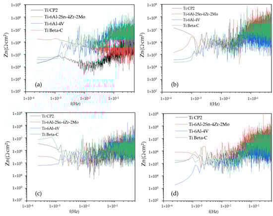 Noise impedance (Zn) for anodized titanium and alloys samples in (a) H2SO4 and (b) H3PO4 in NaCl at 3.5 wt % (c) H2SO4 and (d) H3PO4 immersed in 3.5 wt % H2SO4 solution.