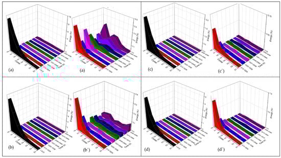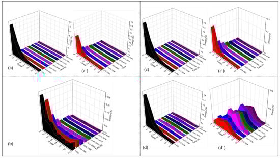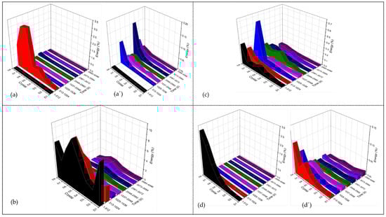 Figure 12 shows the behavior of anodized Ti-6Al-4V by wavelets analysis. Figure 12a–d in the time-lapse of 1–512 and 513 to 1024 s presents a higher energy accumulation in the middle and last crystals; this behavior is related to non-homogenous porosity (middle crystals) and diffusion of the process. In the windowing of 12 (a’), the behavior is ad hoc for diffusion. In the time-lapse of 3585–4096 s (purple), energy accumulates in the middle crystal, and the corrosion process predominates localization due to the dissolution of specific zones in anodization. In Figure 12b’–d’, energy is accumulated equitably, which occurs in a passive system.