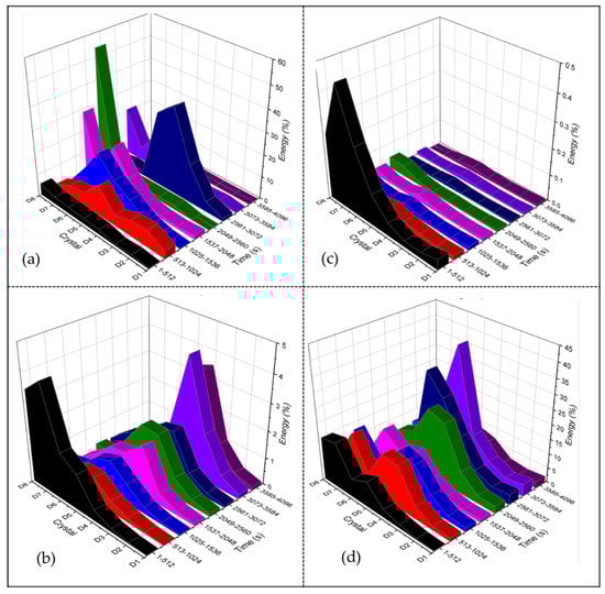 Figure 10c shows a high accumulation of energy in crystal D6, this for non-uniform distribution of porosities. On the other hand, Figure 10d shows high energy accumulation for the last crystals of lapse 1–512 s. In Figure 10d’, the behavior presented is commonly from a passivated system with energy distributed equitably in all crystals in time-lapses of 2049 to 4096 s.