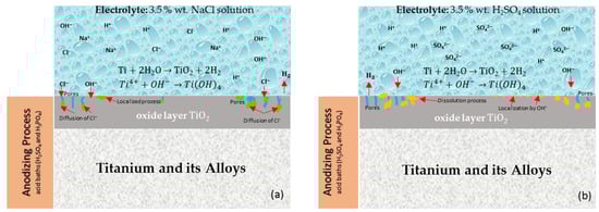 On the other hand, ions such as H+, OH−, or SO4 are smaller and can generate passive layers or cathodic reactions. For this reason, when samples are exposed to 3.5 wt % H2SO4 they show high activity in the middle crystals because the cathodic reaction has been measured. However, H2SO4 can create instability in the development of porosity [,]. Generating a good passivation is necessary to take care of the material surface. If porosity increases, the anodization could be poorer []. The effect of the OH− ion is present in Ti Beta-C anodized in sulfuric acid and immersed in 3.5 wt % H2SO4 solution (Figure 6a): the anodized passive layer formed is broken, and presents instability on the surface due to OH− evolution. Figure 14 shows a diagram with the corrosion mechanism of titanium and its anodized alloys in acid baths.