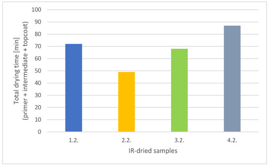 As explained in the introduction, with IR gas catalytic technology, a two-way drying is achieved, and coatings are fully cured in the minimum amount of time. After cooling to room temperature, there is practically no intercoating interval before the next application, meaning that a three-layer coating system can be applied within one working day. Figure 2 shows total drying times of IR-dried coating systems, which are significantly lower than total minimum overcoating intervals at 20 °C from Table 1 and Table 2. Although, according to the manufacturer’s technical specifications, the coatings are fully cured and ready for exploitation after 7 days at 20 °C. Infrared drying not only has a positive impact on the environment through less gas consumption and burning VOCs but it also speeds up the production process with no drop in quality.