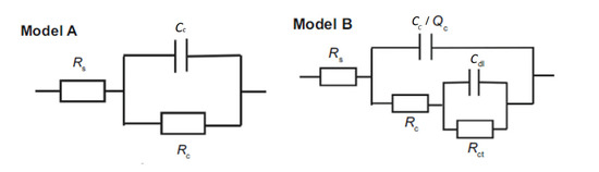 EIS plots of the coated samples were fitted with different equivalent circuit models (Figure 3) depending on the immersion period. Rs represents the electrolyte resistance, Rc is the coating resistance, Cc coating capacitance, and Qc is the constant phase element, which describes coatings nonideal capacitance behavior. Cdl and Rct are the double-layer capacitance and charge transfer resistance at the steel–electrolyte interface, respectively [14]. Model A was used when the coatings exhibited very good barrier properties, at the early stage of exposure, after 24 h. After 250 and 500 h in 3% NaCl, Model B was used because it was likely that aggressive media like water and oxygen penetrated into the coating. CPE is a constant phase element, which depends on the empirical constant n. The constant n is in the range from 0 to 1. If n = 0, the CPE acts as a resistor, and if n = 1, the CPE acts as a capacitor [10].