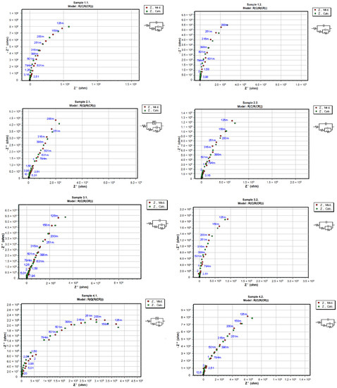 A CNLS (complex non-linear least squares) simulation was performed in order to analyze equivalent circuits and compare experimented and simulated data. Table 6 and Table 7 contain fitted values of equivalent circuit elements (Rs, Rc, Rct, Qc, and Cdl) and the corresponding χ2 modeling errors after 24 and 500 h of immersion in 3% NaCl. Replicated values were in the same range so only the first measurement is shown. The quality of fitting to equivalent circuit was evaluated by the chi-square value (χ2), that is, the sum of the square of the differences between theoretical and experimental points [28]. The lower the chi-square value is, the better fitting results are achieved. Comparison between the experimental data and CNLS simulations in Nyquist representation are shown in Figure 4. Initially, coatings acted as a pure capacitor with very high resistance and very low capacitance. Gradually, water penetrated through the coating causing it to increase its capacitance (Cc/Qc) and drop its resistance (Rc). It was observed that the charge transfer resistance (Rct) predominated over the coating resistance (Rc) in the corrosion mechanism, that is Rct was higher than Rc. These parameters are associated with the dissolution of the metal substrate and the corrosion product formation and the resistance through the porous coating layer [29]. When the electrolyte penetrates into the coating pores, it affects its electrochemical behavior [30]. Double layer capacitance (Cdl) was still very low after 20 days of immersion, indicating that serious delamination under the coating had not happened yet.
