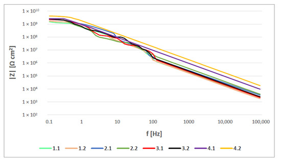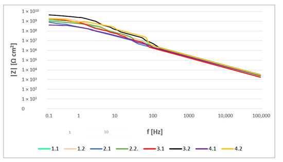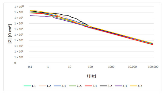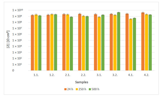 Bode diagrams of examined samples show that coating resistance of all coating systems at the beginning of the exposure (Figure 5) had excellent average values (>109 Ωcm2) for protective coatings [31]. After 250 (Figure 6) and 500 h (Figure 7) in 3% NaCl, average values decreased for most tested coatings, but still displayed very good protective properties (>108 Ωcm2). The coating system with zinc in the epoxy primer (3.1. and 3.2.) even showed an increase in coating resistance after 500 h of exposure, which may be due to the self-healing properties of zinc. Since duplicate experiments were carried out for each sample, Figure 8 represents the average coating resistances of samples at 0.1 Hz for different immersion times.