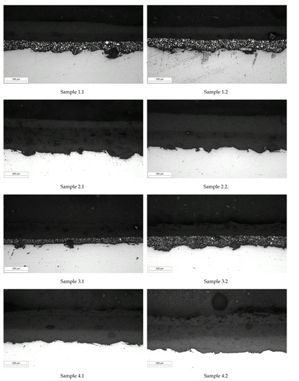 Figure 9 shows all samples analyzed by Olympus GX51 (Olympus Corporation, Tokyo, Japan) inverted metallurgical microscope with 100× magnification. On each cross-section, the layer thickness was measured. It is evident that the applied coatings have uniform thickness and appear adequately cured with no defects. There are no signs of crack and pores, and the coating thickness corresponds with the ones measured with the magnetic method.