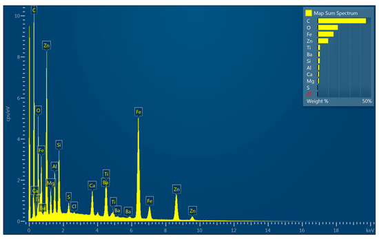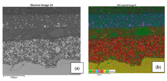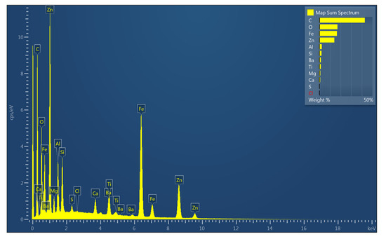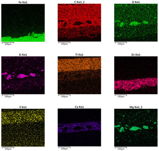 Samples 1.1. and 1.2. were chosen for scanning electron microscope (SEM) with energy-dispersive X-ray spectroscopy to examine the surface morphology, pigment distribution, and chemical composition. The SEM micrograph for Sample 1.1. in Figure 10a shows that Zn-rich primer firmly adheres to the steel substrate and that there is also good adhesion between layers. The elemental mapping by EDX spectroscopy in Figure 10b shows the presence of various elements depending on the coating layer. Further analysis provided in Figure 11 shows that Zn is evenly distributed in the primer, C and O can be found in all layers, and Ti as a pigment is dominant in the topcoat where it gives PUR its specific properties. Mapping of epoxy intermediate shows Ca distribution across all layers, except in Mg-Si-O inclusions.