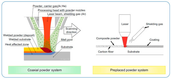 Scheme showing the laser cladding systems for coaxial (left) and preplaced (right) powder cases. Reprinted with permission from Ref. [1]. Copyright 2021 Elsevier.