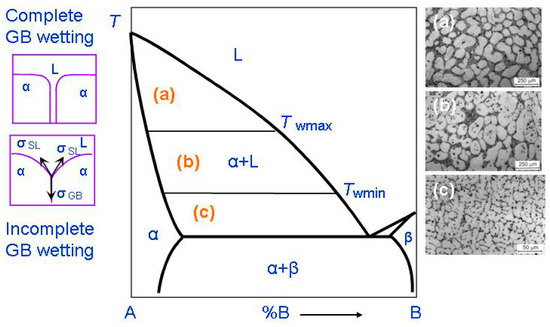 Typical examples of such two-phase polycrystals microstructures are shown in Figure 2 for the binary Al–Mg alloys. Thus, regarding the GB wetting phase transitions, the bulk phase diagram becomes two additional GB tie-lines. The Twmin tie-line corresponds to the GBs wetting transition from partial to complete wetting for the grain boundaries having highest energy σGB. Under Twmin one cannot observe in the alloy any fully wetted GB. The polycrystal under Twmin contains only partially wetted GBs with θ > 0. First, completely wetted GBs appear with the heating of the alloy above Twmin. Above Twmin, the portion of fully wetted GBs increases with increasing temperature. At Twmax it reaches unity. Another tie-line shows the temperature Twmax. Above Twmax all GBs contain the melted layer and are, therefore, completely wetted. In this case each grain is completely surrounded by the melt. It cannot contact other abutting grains. This is because the non-wetted GBs are thermodynamically disadvantageous above Twmax. In other words, above Twmax all solid crystallites are detached from their neighbors by the skins of a liquid phase. Thus, a conventional binary phase diagram becomes the new GB tie-lines in the α + L area. Such new tie-lines are due to the GB wetting phase transitions. The conventional phase diagrams suppose that all bulk phases are single crystals and ignore the GBs and GB phenomena.