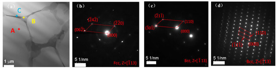 TEM micrographs for the AlCoCrFeNiTi0.5 coating: (a) bright field image of DR and IR phases, (b) SADP of bulk area A, (c) SADP of GB area B, (d) SADP of GB area C. Reprinted with permission from Ref. [62]. Copyright 2021 Elsevier.