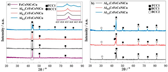 XRD patterns of AlxCrFeCoNiCu HEA coatings. (a) coatings with low Al content, (b) coatings with medium-Al content. Reprinted with permission from Ref. [64]. Copyright 2021 Elsevier.
