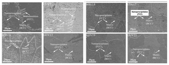SEM micrographs of Al16.80Co20.74Cr20.49Fe21.28Ni20.70 HEA coatings deposited with different laser scanning speeds: (a,b) are the coatings named as V7 and V9. They contain Widmanstätten side plate and nanoprecipitates; (c–h) the coatings named as V11–V21 contain only nanoprecipitates, without Widmanstätten plate. Reprinted with permission from Ref. [70]. Copyright 2021 Elsevier.