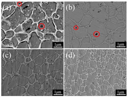 SEM micrographs of MgMoNbFeTi2Yx HEAs (a) x = 0, (b) x = 0.4%, (c) x = 0.8%, (d) x = 1.2%. The black arrows in Figure 13a show the particles of iron, magnesium and yttrium oxides. The red circles in Figure 13a,b mark black particles of intermetallic compounds. Reprinted with permission from Ref. [78]. Copyright 2020 Elsevier.