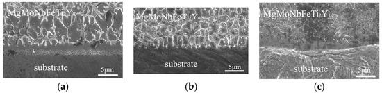 Consider now the HEA coatings containing two phases like alloys shown in Figure 4, Figure 7 and Figure 8. In Ref. [78], the MgMoNbFeTi2Yx HEAs were studied for x = 0, 0.4%, 0.8% and x = 1.2% with average coating thickness of 1.3 mm after laser cladding. The coatings contained the major bcc phase rich in Mo and Nb, minor bcc phase rich in Mg and Ti as well as small amounts of oxides and (Nb,Ti)C carbide. Figure 13 shows the SEM micrographs of MgMoNbFeTi2Yx HEA for (a) x = 0, (b) x = 0.4%, (c) x = 0.8%, (d) x = 1.2%. These are the cross sections made at the 0.3 mm depth from the coating surface. The microstructure is very similar to those shown in Figure 4, Figure 7 and Figure 8 for the GB wetting of two-phase HEAs. Here, the minor bcc-phase also wets the majority of GBs in the major bcc-phase. The black arrows in Figure 13a show the particles of iron, magnesium and yttrium oxides. The red circles in Figure 13a,b mark black particles of intermetallic compounds. The addition of yttrium leads to the obvious grain refinement. The cross-sections through all thickness of the coating and substrates in Figure 14 show that the double-phase structure with wetted GBs does not form immediately at the beginning of solidification. To the contrary, close to the substrate the 2–4 μm thick layer of the major bcc-phase crystallizes first. The double-phase structure with wetted GBs forms later. Similar behavior of the GB wetting in the cross-section of two-phase laser-cladded HEAs was observed for the AlxMo0.5NbFeTiMn2 (x = 1, 1.5, 2) alloys [79], AlCrFeNi2W0.2Nbx (x = 0.5, 1, 1.5, 2) alloys [80], FeCrCoAlMn0.5Mo0.1 HEA [81], and Fe5Cr5SiTiCoNbMoW HEA [82]. In the last case, the 5–7 μm thick one-phase layer close to the substrate is clearly seen.
