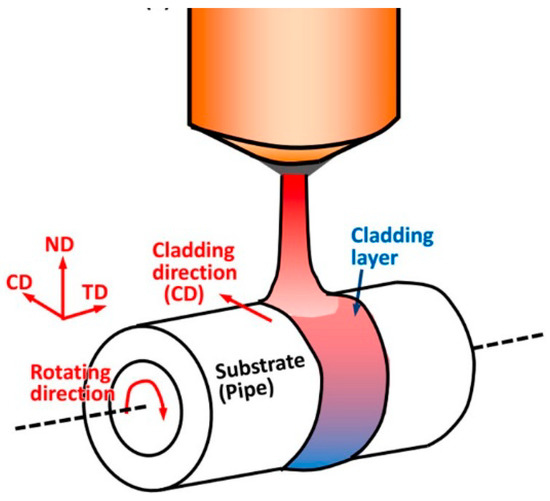 In case of the deposition of an HEA coating by the laser cladding on a pipe (Figure 16), the consecutive layers strongly overlap each other [92]. During the cladding process, the powder becomes a liquid alloy after heating by a laser beam and falls on the surface of the substrate. During the cladding process, the steel pipe (substrate) is rotated at a high speed. The powder feeding nozzle and laser beam move along the TD.