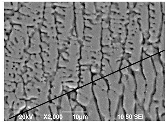 SEM micrograph revealing the morphologies on the both side of the re-melted boundary between 1st and 2nd layers of the AlCoCrCuFeNi HEA coating (denoted by the line). Reprinted with permission from Ref. [94]. Copyright 2019 Elsevier.