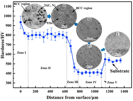 The HEA gradient coating: the hardness depth profile. The microstructures are placed at corresponding depth. The meaning of Zones I to V is explained in the text. Reprinted with permission from Ref. [95]. Copyright 2021 Elsevier.
