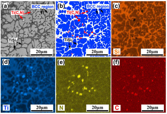 The microstructures with EBSD and EDS results of in the zone I (see Figure 12), (a) EBSD band contrast (BC) map, (b) EBSD phase map, (c–f) EDS element distribution maps for Si, Ti, N and C. Reprinted with permission from Ref. [95]. Copyright 2021 Elsevier.