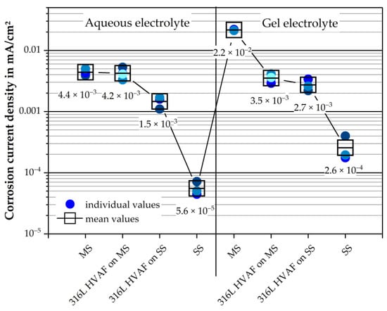 - Followed from this, the corrosion characteristic values such as OCP, ECorr, and iCorr obtained are independent of whether the AISI 316L HVAF coating was deposited on mild steel or stainless-steel substrates when using gel electrolyte.