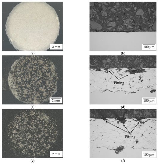 The results of the electrochemical corrosion test in aqueous NaCl electrolyte demonstrate for the AISI 316L HVAF coatings deposited on mild steel and stainless steel, respectively, that the different behavior in the potentiodynamic polarization curves (Figure 5b) nevertheless led to an equal corrosion attack of the coatings (Figure 6c–f). It is therefore not possible to evaluate the corrosion resistance of the coating system independent of the substrate material used.