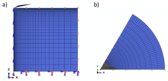 Illustration of the mesh and boundary conditions of the numerical model used for the determination of the yield strength by parametric identification: (a) view in a radial plane, (b) top view.