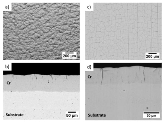 The surface of the hexavalent chromium deposits shows a more pronounced nodular morphology than the trivalent chromium deposits (Figure 2a,c). Whatever the type of deposit, a network of cracks is observed on the surfaces. The cross-sectional observations show the presence of multiple cracks distributed throughout the thickness of the deposit (Figure 2b,d). In the case of trivalent chromium, we also observe the presence of cracks crossing the entire thickness of the deposit (Figure 2d).