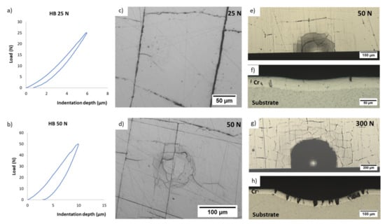 The identification of the mechanical behaviour of trivalent chromium coatings was determined from instrumented Brinell indentation tests. The charge–discharge curves and indentation observations for beads of 1 mm diameter and a deposit thickness of 100 microns are shown in Figure 3a–d. For low applied loads, residual indentations are not visible (Figure 3c). They are discernible for a load of 50 N for tests performed with the 1 and 5 mm ball. The residual depth increases with the applied load (Figure 3b).