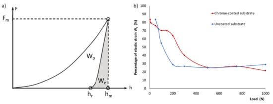 (a) Determination of elastic and plastic deformation work from a loading–unloading curve. (b) Evolution of the percentage of elastic strain energy expended during Brinell indentation tests as a function of the applied load (with a 5 mm ball and a deposit thickness of 40 µm).