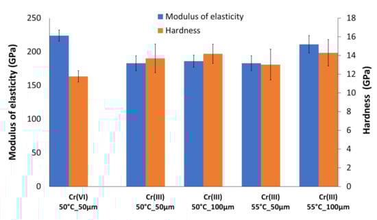 - The modulus of elasticity was determined by nanoindentation tests. Depending on the processing conditions, the values varied from 182 to 211 GPa on trivalent chromium coatings. The average value was 15% lower than those of the hexavalent chromium deposit.