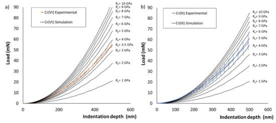 Comparison of the evolution of the applied force as a function of the indented depth determined experimentally and by simulation: deposits of (a) hexavalent and (b) trivalent chromium. Loading curves obtained by simulation for yield strength values between 1 and 10 GPa.