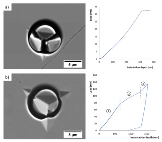 The yield strength was determined by inverse methods. We used the experimental force–displacement curves to fit a numerical simulation model. The Berkovich indentation at low load was used to avoid cracking as much as possible. The method used was inspired by the work of Sebastiani et al. []. A trial-and-error method was used to calibrate the curves.