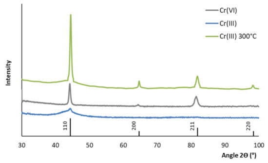 - Willis, D.J.; Hammond, C. Structure of Chromium Deposits from Plating Solutions Containing Trivalent and Hexavalent Chromium. Mater. Sci. Technol. 1986, 2, 630–636. [Google Scholar] [CrossRef]