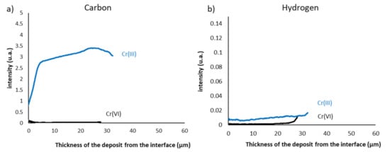 A minimum value of 5 MPa√m was estimated for the hexavalent chromium deposit through the micropillar indentation test. This value is of the same order of magnitude as that given in the literature. Durut characterised this value from the volume of the plasticised zone located at the crack tip. He estimates the toughness of these hexavalent chromium deposits at 3.42 MPa√m []. Chen et al. determined a toughness value of 10.5 MPa√m for their hexavalent chromium deposit using a tensile test, focusing on the stress in the coating generating the first crack []. The value of trivalent chromium deposits is lower than that of hexavalent chromium deposits. This is related to the higher cracking density of the trivalent chromium deposits. The surface crack density was determined for each coating from the analysis of micrographic observations obtained by scanning electron microscopy (SEM ZEISS EVO HD 15) at a magnification of × 100. The surface area of the analysed zone represents a surface of 7 mm². The measurement of the cracking rate is based on the intercept method. The average distance between each crack is calculated as the ratio between the total length of the lines drawn and the number of intersections. For hexavalent and trivalent chromium coatings, the average crack distances are 74 ± 8 and 93 ± 11 µm, respectively. Briant et al. have shown that chromium containing a high interstitial carbon content is brittle at room temperature []. However, trivalent chromium deposits are known to contain a high carbon content due to the additives added to the electrolyte to destabilise the [Cr(H2O)6]3+ chromium complex. The evolution of the carbon and hydrogen content in the hexavalent and trivalent chromium deposits was therefore measured by glow discharge spectrometry with the GD-Profiler 2 spectrometer (GD-Profiler 2, Horiba, Palaiseau, France) from HORIBA, which is equipped with a radio-frequency source and a polychromator for the analysis of 42 chemical elements (Figure 9). These analyses attest to high carbon content in the trivalent deposit and therefore justify their lower tenacity.